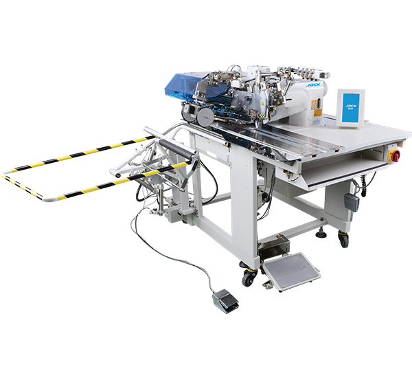 A modern machine designed for sewing straight pockets with one or two welts, with or without a flap in clothing products such as suits, jackets and pants. All operating parameters and the type of pocket are programmable on a readable, touch control panel. The machine uses a head with a built-in servo motor with a power of 750W (Direct Drive system), which ensures lower energy consumption and quiet operation. The machine as standard is equipped with a stacker receiving sewn-in elements and a laser marker ensures the correct positioning of the sewn-in element.