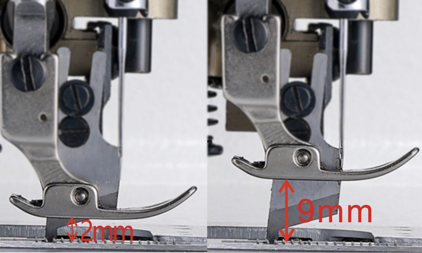 Tính năng này mang lại sự linh hoạt vượt trội, cho phép người dùng điều chỉnh độ cao nâng chân vịt lên tới 9mm ngay từ bảng điều khiển (panel) chỉ bằng một thao tác nhấn nút (click). Điều này giúp việc thay đổi độ cao chân vịt nhanh chóng và chính xác tuyệt đối, đặc biệt cần thiết khi xử lý các vật liệu có độ dày thay đổi hoặc khi cần nhấc chân vịt cao hơn để đưa các chi tiết may cồng kềnh vào dưới kim.