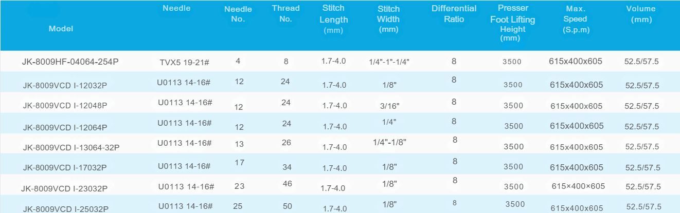 Độ Bền Bỉ và Ổn Định: Thiết kế JK-8009VCDI-13064-32P đảm bảo máy hoạt động ổn định ở tốc độ cao (VCDI), giảm thiểu rung lắc và bảo trì, phù hợp cho môi trường sản xuất quy mô lớn.