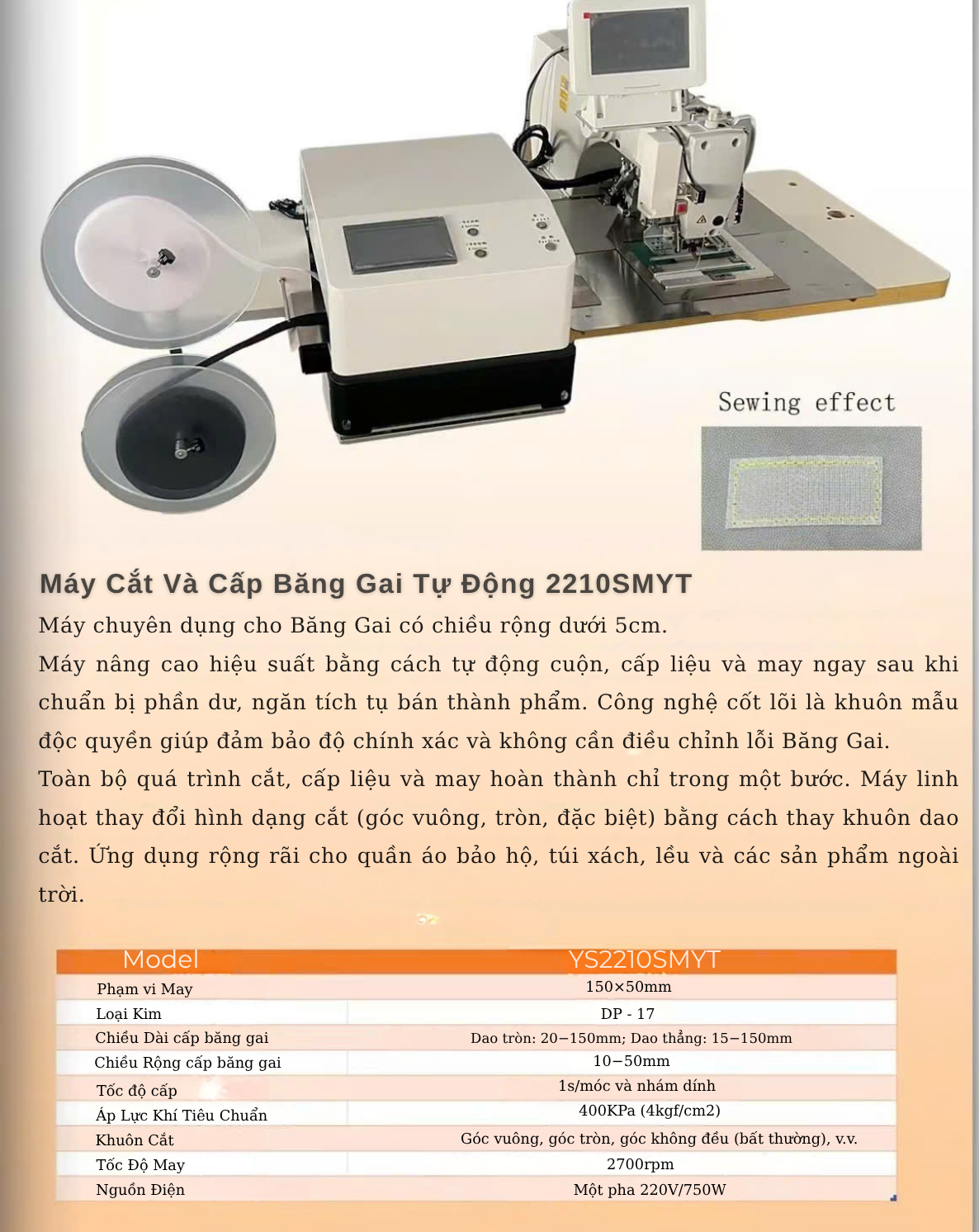 Máy may Băng Gai tự động 2210 được thiết kế để xử lý Băng Gai có chiều rộng dưới 5cm, hoàn hảo cho các chi tiết nhỏ và vừa.