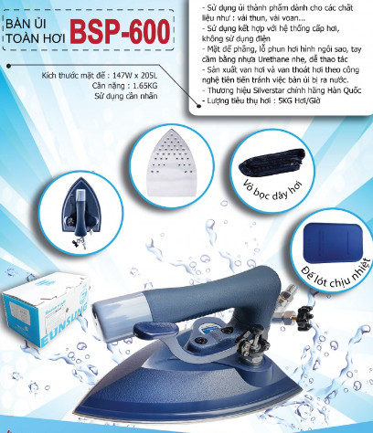 Công dụng Bàn ủi toàn hơi BSP-600: Dùng để ủi thành phẩm có chất liệu: vải thun, vải xoan,…