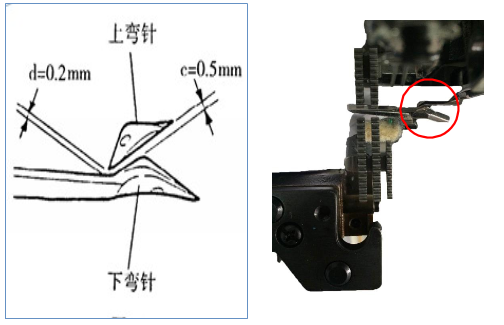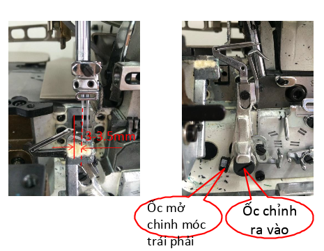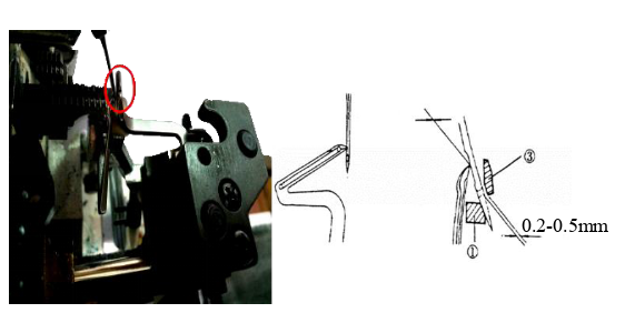 Phần cơ-móc dưới: khi trụ kim thứ nhất đầu móc cách kim thứ nhất 3mm-3.5 mm, khoảng cách hở giữa kim và móc là 0.03-0.05mm.