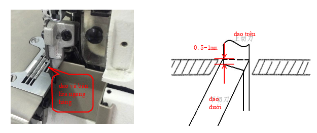 Phần cơ- dao trên –dao dưới: Dao dưới bằng với bàn lừa, vị trí trái phải theo dao trên làm chuẩn, dao trên dựa theo độ rộng bao biên làm chuẩn, dao dưới ngậm từ 0.5-1mm.