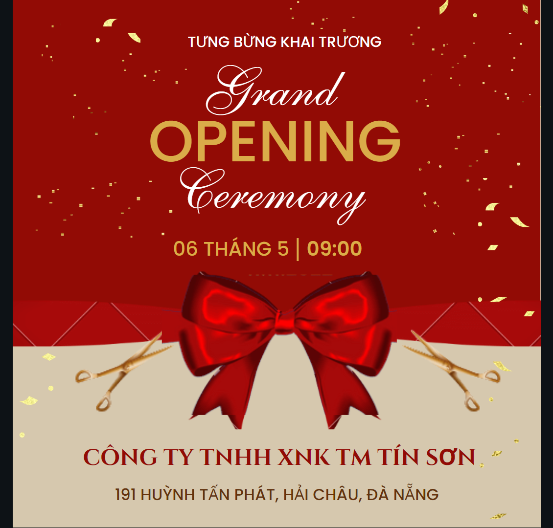 Cảm ơn quý khách đã đồng hành cùng Tín Sơn trong thời gian vừa qua. Để tiếp tục đáp lại sự ủng hộ và tin tưởng của toàn bộ khách hàng đối với sản phẩm và dịch vụ của mình, ngày 06/05/2023 này, Tín Sơn chính thức khai trương công ty mới tọa lạc tại địa chỉ 191 Huỳnh Tấn Phát, Hòa Cường Nam, Hải Châu, Đà Nẵng nhằm phục vụ riêng cho các qúy khách hàng tại miền Trung và các khu vực lân cận.